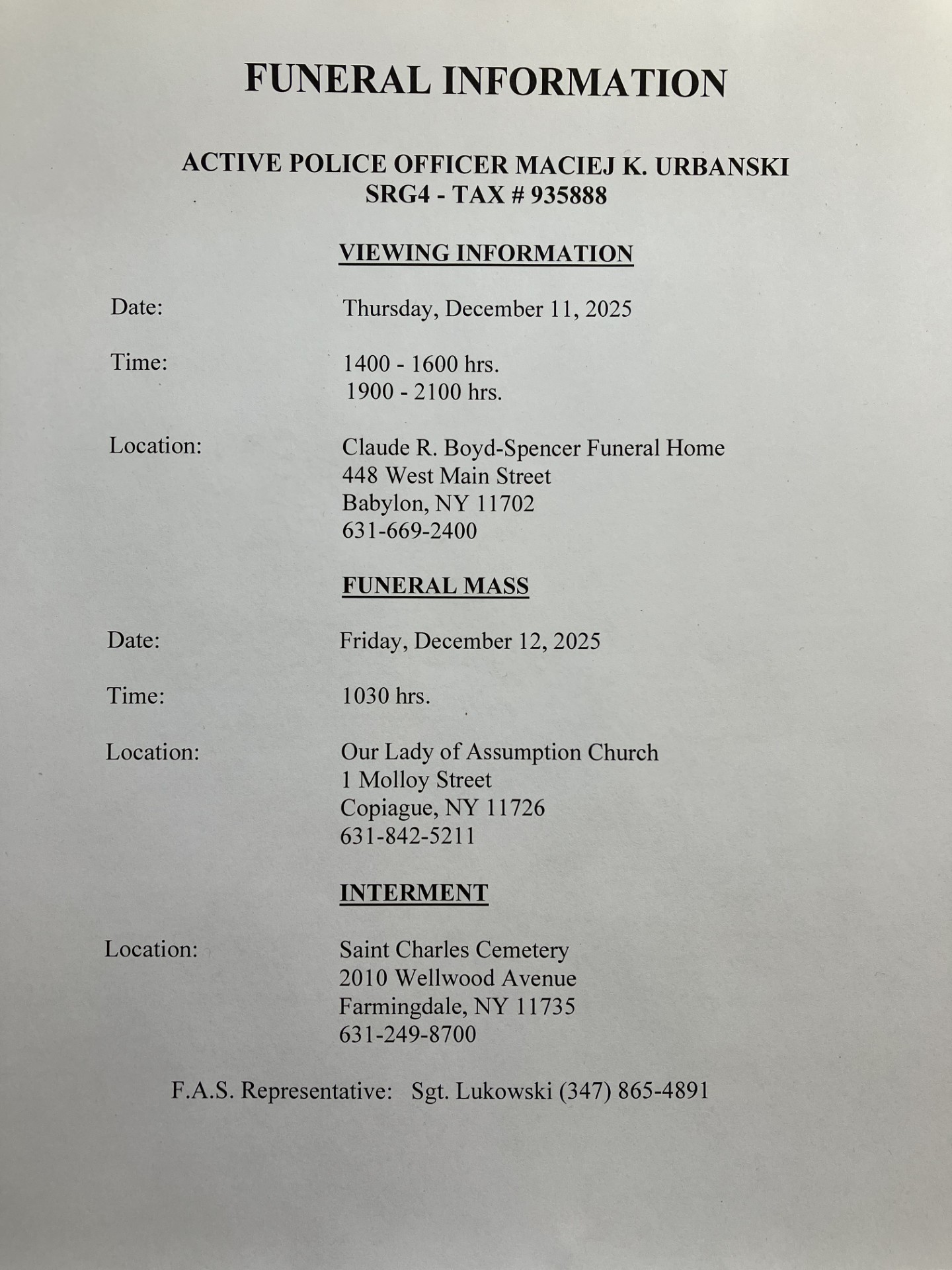 Funeral Information for Active Police Officer Maciej K. Urbanski