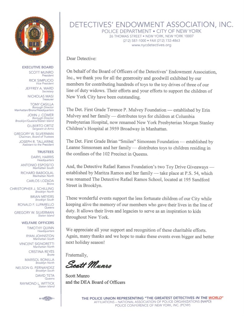 The DEA wishes to thank all of our members who participated in our efforts to contribute toys to three of the Foundations established by our line of duty widows.